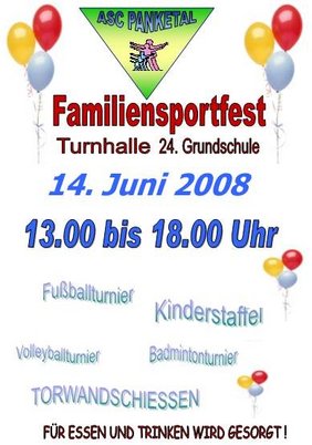 Unser Familienfest am 14.06.2008 war wieder ein gelungenes Fest. Pünktlich um 12.00 Uhr begannen wir mit den Vorbereitungen. In der Sporthalle wurde für unsere Kleinen Stationen aufgebaut. Die Volleyballer und Badmintonspieler bauten ebenfalls ihre Netze auf.